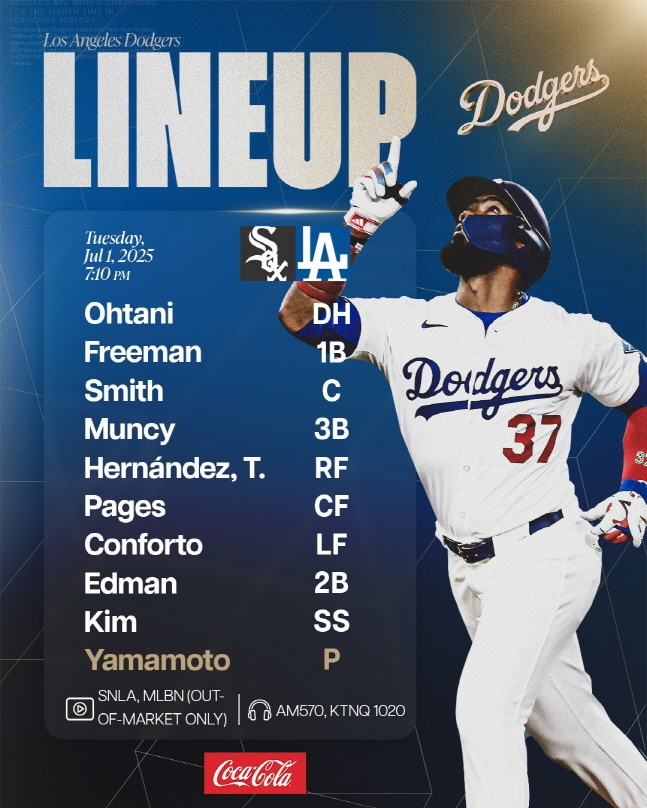 이날은 김혜성이 유격수로 나서 오타니 쇼헤이(1번 지명타자)에게 연결해주는 역할을 맡는 동시에 토미 에드먼(8번 2루수)과 키스톤 듀오를 이룬다.