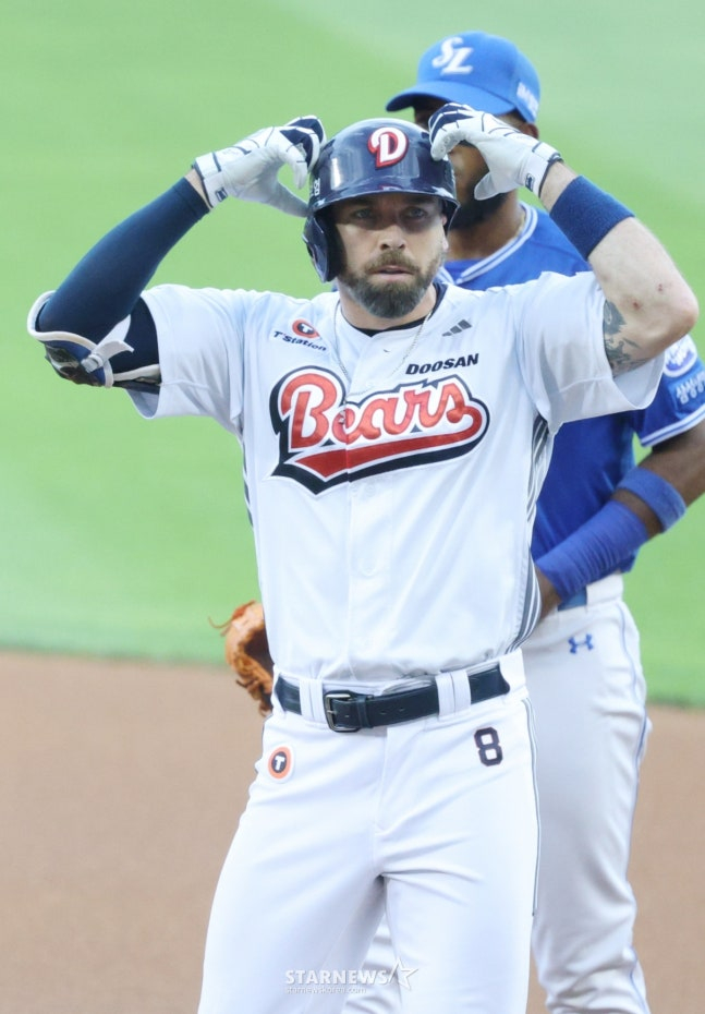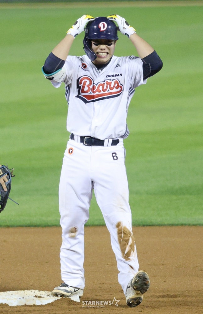 삼성이 기회를 놓치자 두산은 8회말 추가 득점으로 승부에 쐐기를 박았다. 선두타자 김민석이 우전 안타로 출루했고, 이유찬 타석에서 폭투가 나와 무사 2루가 됐다. 이유찬의 번트로 1사 3루로 기회가 이어졌다.