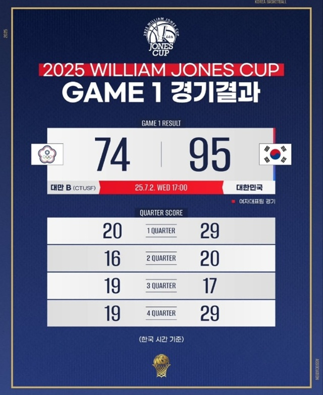 박수호 감독이 이끄는 한국 여자농구 대표팀은 2일(한국시간) 대만 타이베이의 허핑 농구체육관에서 열린 2025 윌리엄 존스컵 여자부 1차전 대만 유니버시아드 대표팀(대만 B팀)과 맞대결에서 95-74, 21점차 대승을 낚았다.