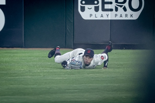 자칫하면 타구가 뒤로 빠져 동점이 될 뻔했는데, 마지막 순간 집중력을 발휘해 공을 잡아냈다. 김동혁(25·롯데 자이언츠)이 모두의 가슴을 철렁하게 만들었다.