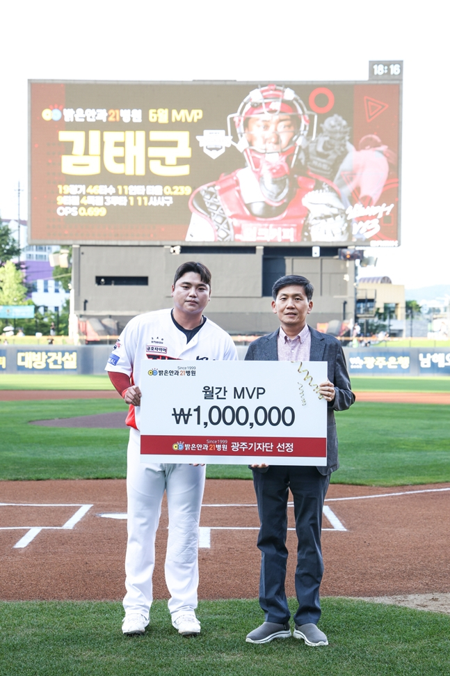 이날 김태군에 대한 시상은 밝은안과21병원 반태수 원장이 했고, 시상금은 100만원이다. 3일 SSG전 출장 준비 관계로 한준수가 대리 수상했다. KIA 구단은 "김태군은 시상금 중 50만원을 어려운 이웃 돕기에 써달라며 기부했다"고 밝혔다.