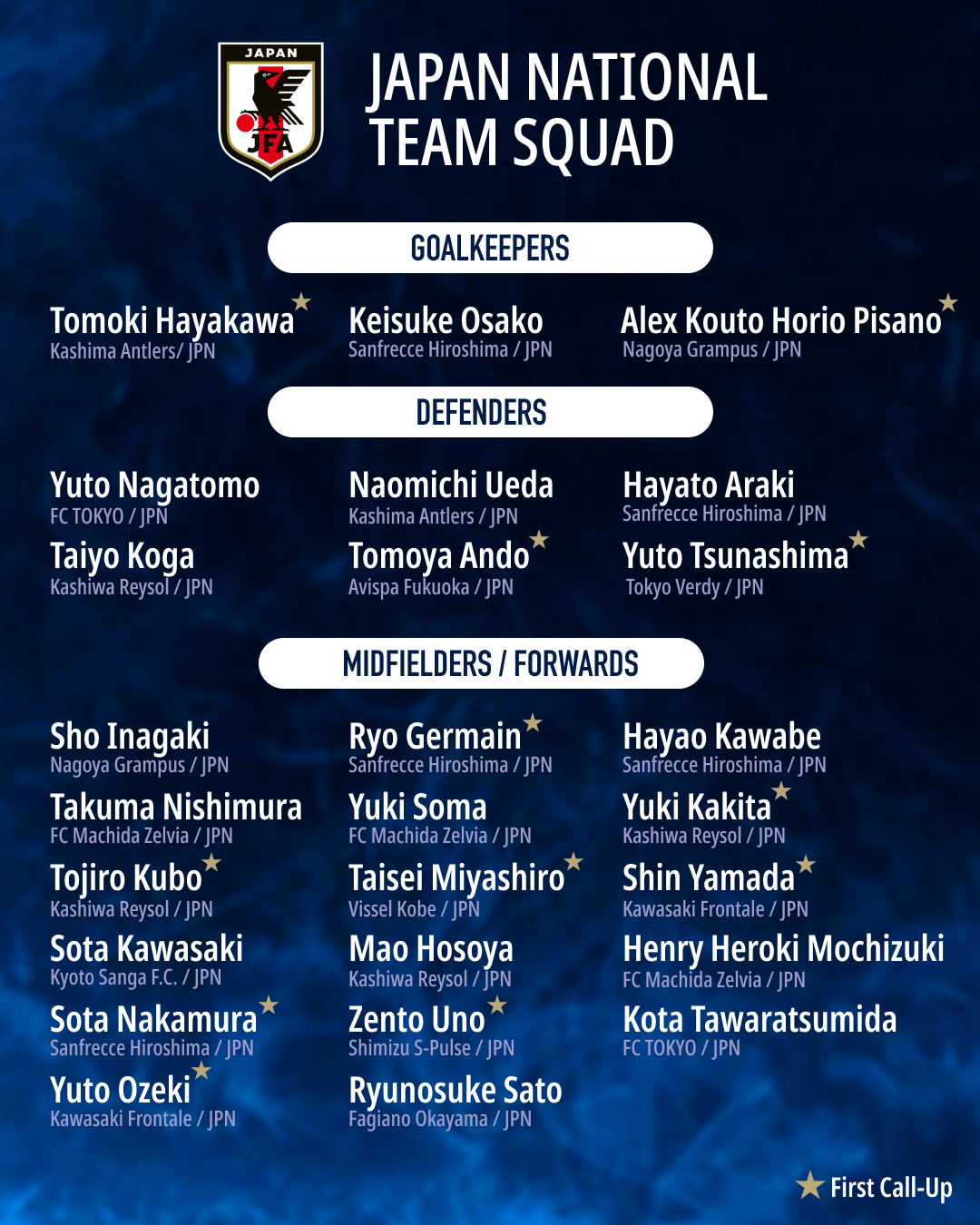 그렇다고 J리그에서 좋은 활약을 펼치고 있는 선수들이 대거 합류한 것도 아니다. 월드컵 예선에서 꾸준히 발탁됐던 골키퍼 다니 고세이(마치다 젤비아)나 J1리그 일본 선수 중 최다골(8골)을 기록 중인 기타가와 고야(시미즈 S-펄스), 두 번째로 많은 스즈키 유마(가시마 앤틀러스·7골) 등은 낙마했다. 반면 소속팀 FC도쿄에선 주전이 아닌 1986년생 나가토모 유토(39)는 경기장 안팎에서 선수들의 성장에 도움을 주는 역할로 발탁됐다. 3년 전 J3리그에서 뛰다 승격을 거듭해 첫 대표팀 발탁 영예를 안은 190cm 센터백 안도 도모야(26·아비스파 후쿠오카), 4개월 전까지만 해도 대학생 신분이던 나카무라 소타(23·산프레체 히로시마) 등 오히려 '이색 이력'을 가진 선수들이 더 눈에 띈다는 게 현지 보도 분위기이기도 하다.