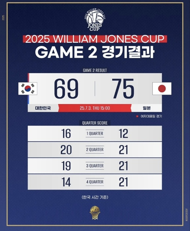 박수호 감독이 이끄는 한국 여자농구 대표팀은 3일 대만 타이베이의 허핑 농구체육관에서 열린 2025 윌리엄 존스컵 2차전 일본에 69-75 역전패를 당했다.