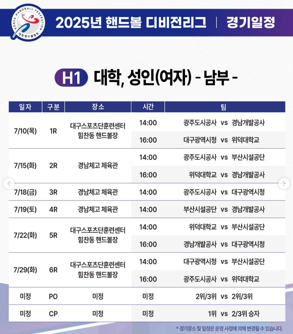 협회는 "디비전리그는 기존의 단기 대회 위주 운영 방식을 넘어, 리그 체제로 경쟁하며 연중 경기를 이어가는 새로운 구조의 핸드볼 리그"라고 강조했다.