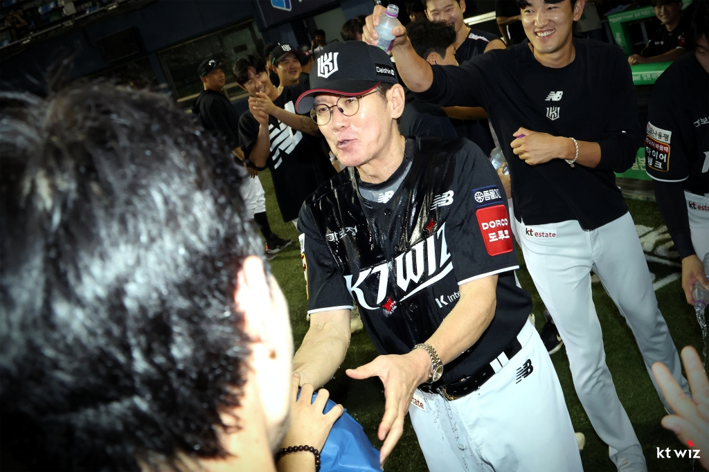 승리 후 500승을 챙긴 이강철 감독은 KT 선수들로부터 물세례를 받으며 기쁨을 누렸다.