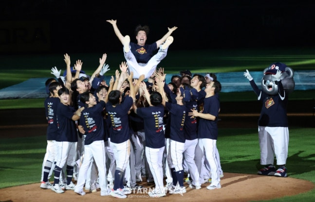 김재호가 은퇴사를 마무리한 뒤 유격수 자리로 이동, 흙을 직접 퍼 소장하는 퍼포먼스를 펼쳤다. 그리고 선수단과 단체 기념사진을 찍은 뒤 헹가래를 받으며 환하게 웃었다.