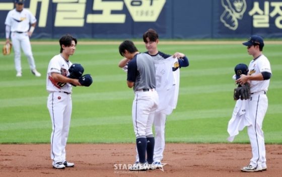김재호의 교체. '고졸 신인' 박준순이 그를 대신해 들어갔다. 김재호는 등번호 52번이 적힌 자신이 착용한 유니폼을 벗어 박준순에게 전달했다. 올해 신인 박준순의 등번호는 52번. 김재호의 등번호를 물려받았다. 박준순이 3루수로 이동했고, 이유찬이 유격수를 맡으며 경기가 재개됐다.