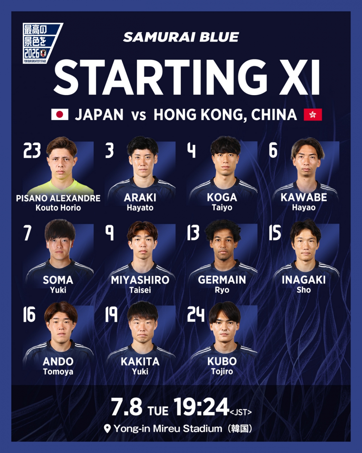모리야스 하지메(57) 일본 감독은 3-4-2-1 포메이션을 꺼냈다. 아라키 하야토(산프레체 히로시마), 고가 타이요(가시와 레이솔), 안도 도모야(아비스파 후쿠오카)가 수비를 맡는다. 스리백 앞에는 소마 유키(마치다 젤비아), 료 제르망(히로시마), 이나가키 쇼(나고야 그램퍼스)와 가와베 하야오(산프레체 히로시마). 쿠보 토지로(가시마)와 미야시로 다이세이(비셀 고베)가 2선에 서고 가기타 유키(가시마 앤틀러스)가 최전방을 맡는다.