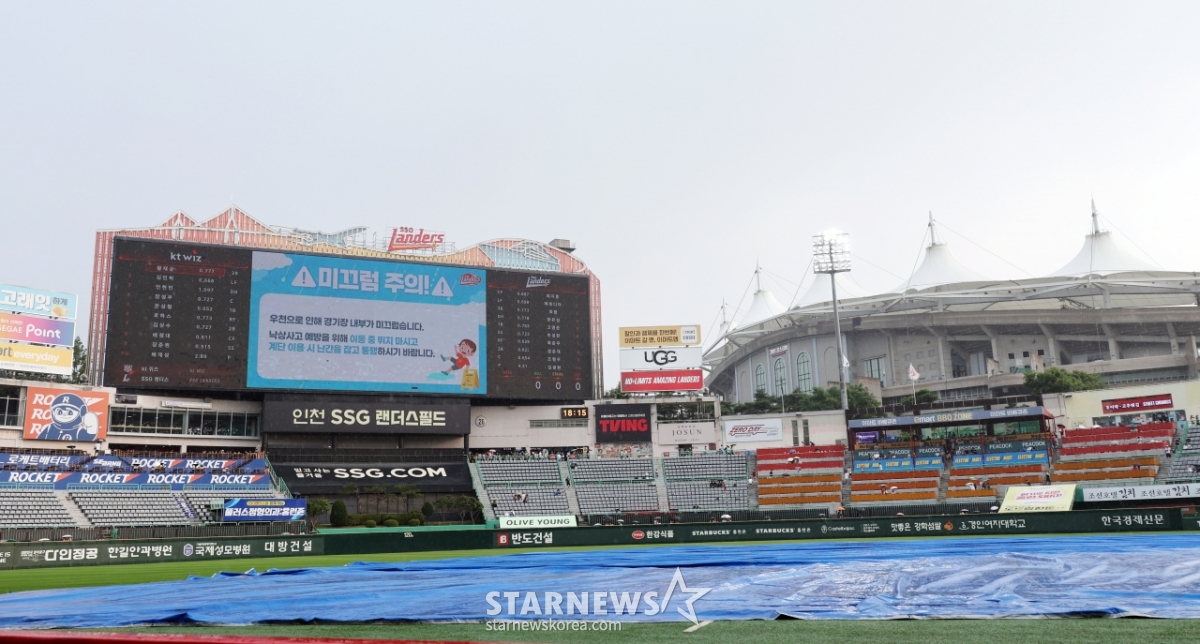 스포츠야구[포토]폭염주의보에 '갑작스런 소나기로' 지연되는 KT-SSG 경기발행 : 2025.07.08 ・ 18:27인천=강영조 선임기자연일 30도를 훌쩍 넘는 폭염이 지속되는 가운데 8일 인천SSG랜더스필드에서 열릴 2025KBO리그 SSG랜더스와 KT위즈 경기가 경기개시를 20여분 앞두고 장대비가 쏟아져 지연되고 있다. 2025.07.08.<저작권자 © 스타뉴스, 무단전재 및 재배포 금지>KTSSG랜더스경기폭염지연인천추천 기사강영조 선임기자기자홈좋아요 스포츠-야구의 인기 급상승 뉴스스포츠-야구의 최신 뉴스