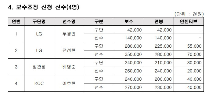 화제를 모았던 KBL 연봉 조정 신청에서 두경민(34)과 전성현(34·창원 LG 세이커스)이 모두 구단을 상대로 승리를 거뒀다. KBL은 두경민과 전성현을 손을 들어줬다. 반면 부산 KCC 이호현과 안양 정관장 배병준은 구단 제시 금액이 더 적절하다는 판단을 내렸다.