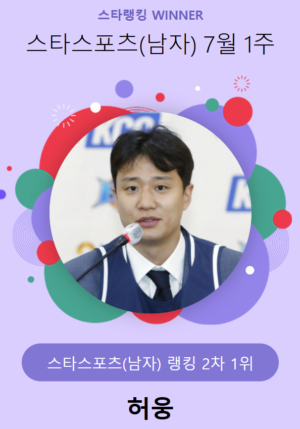 허웅은 스타뉴스가 지난 3일 오후 3시 1분부터 10일 오후 3시까지 일주일 동안 진행한 스타랭킹 스타스포츠 남자 2차(7월 1주) 투표에서 1만 4953표를 얻어 1위를 차지했다. 지난 주 남자 1차 투표에서는 김도영에게 선두를 내줬으나 일주일 만에 다시 최고 인기 스타임을 입증했다.