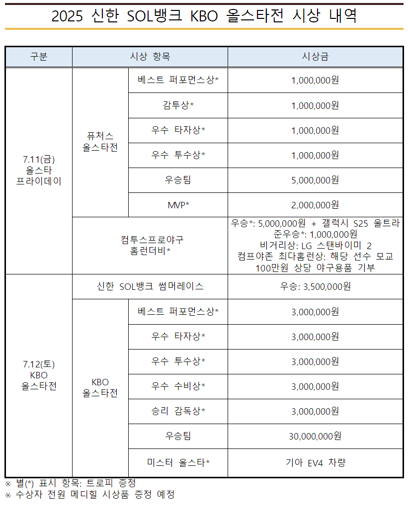 오는 11일과 12일 양일간 대전 한화생명 볼파크에서 열리는 2025 신한 SOL뱅크 KBO 올스타전의 행사 참석 선수와 시상 내역이 최종 확정됐다.