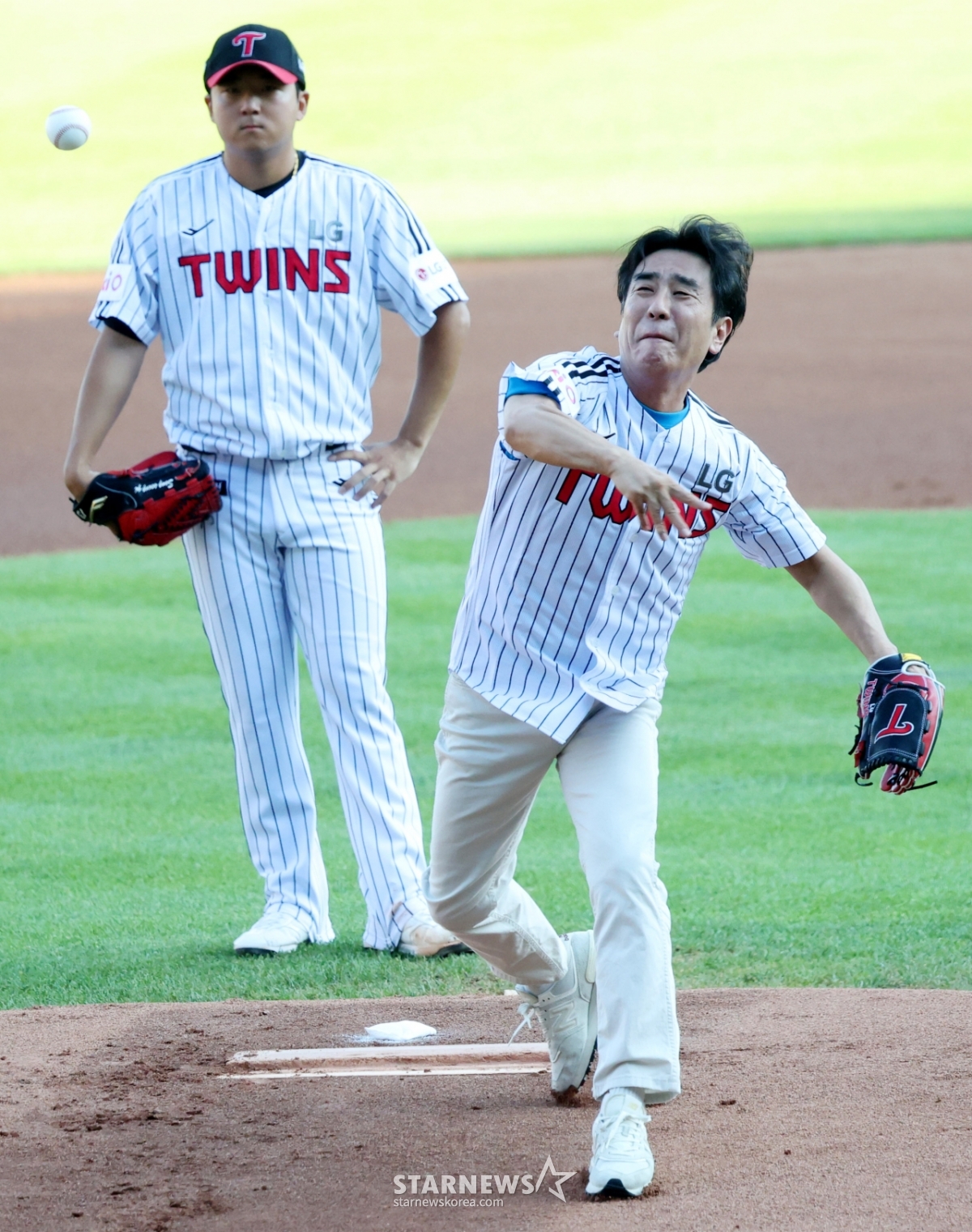 배우 류승룡이 LG 승리기원 시구를 하고 있다.