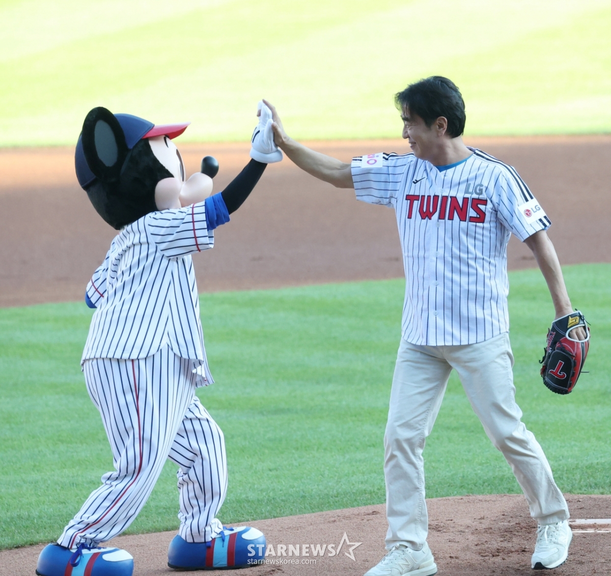 배우 류승룡이 LG 승리기원 시구를 하고 있다.
