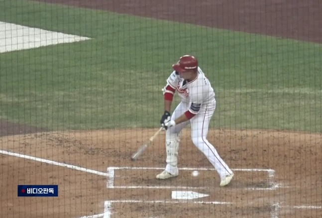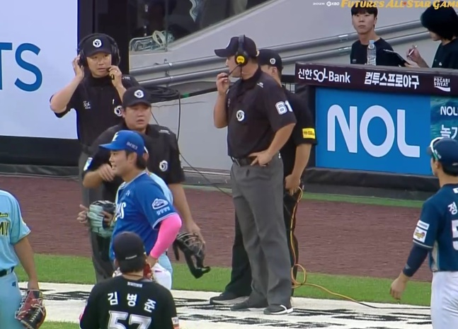 언제 처음으로 체크스윙 비디오 판독이 실시될지 궁금증을 자아낸 가운데, 생각보다 빠르게 상황이 나왔다. 2회말 북부리그의 공격, 2사 1, 2루 상황에서 8번 이승민(SSG)이 타석에 들어섰다. 2스트라이크에서 볼 하나를 골라낸 그는 4구째 낮은 변화구에 방망이를 내다가 멈췄고, 공은 그의 왼쪽 발을 때렸다.