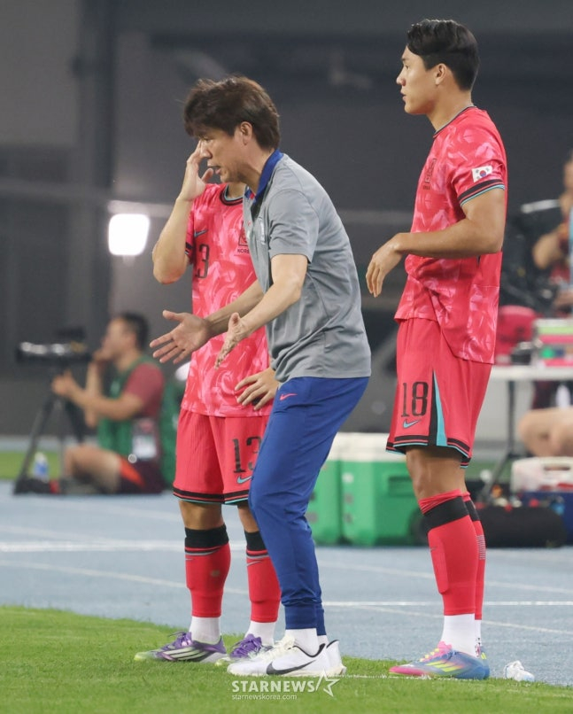 교체 투입을 앞두고 있는 강상윤(왼쪽)과 이호재(오른쪽)에게 작전 지시를 하고 있다. /사진=김진경 대기자