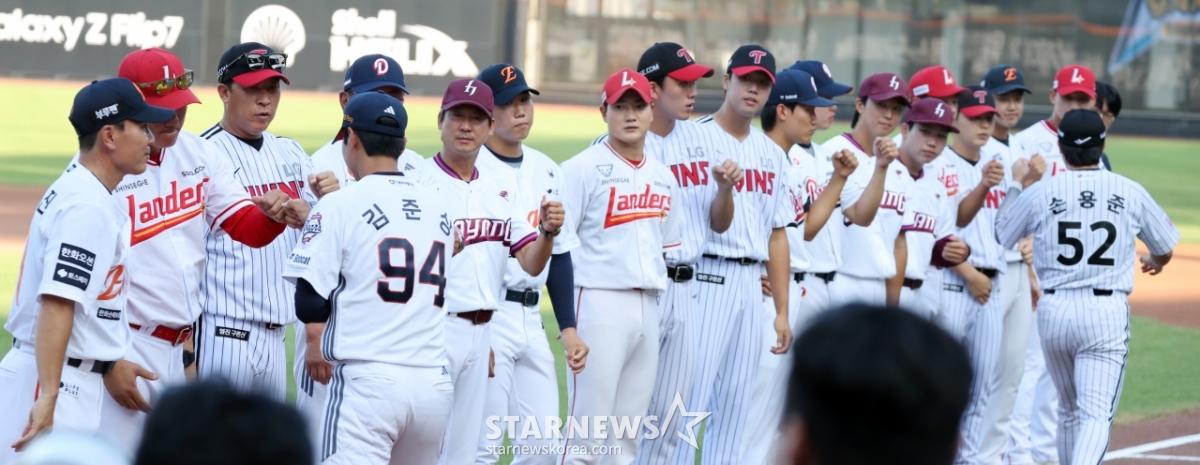 북부리그 이대진 감독과 퓨처스 감독들이 11일 대전한화생명볼파크에서 열린 2025KBO리그 퓨처스리그 올스타전 남부리그 대 북부리그경기에서 개막을 위해 그라운드에 도열해 선수들을 환영하고 있다. 2025.07.11.