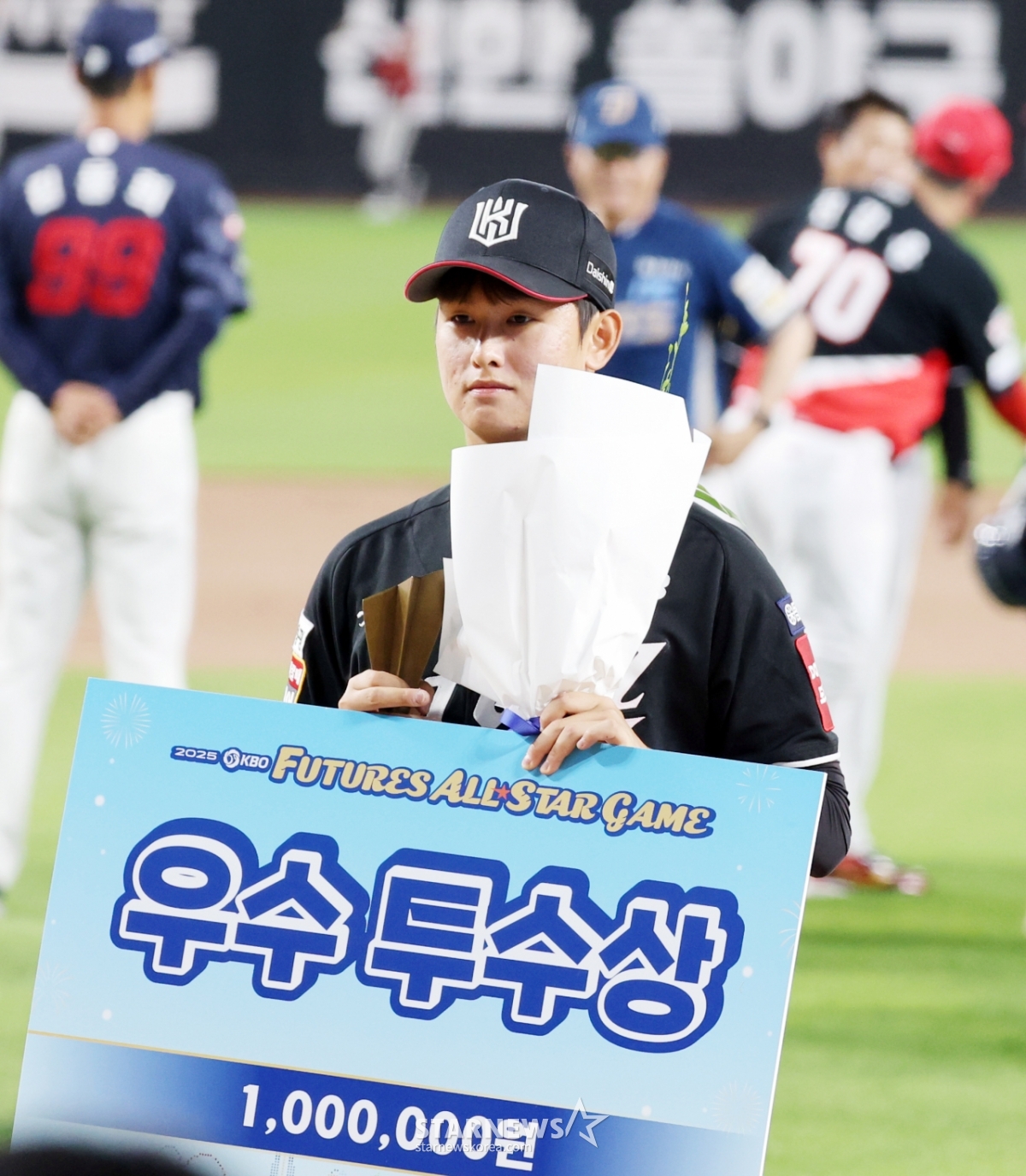 남부 올스타 강건이 11일 대전한화생명볼파크에서 열린 2025KBO리그 퓨처스리그 올스타전 남부리그 대 북부리그 경기에서 우수투수상을 박근찬 KBO사무총장으로부터 수상하고 있다. 2025.07.11.