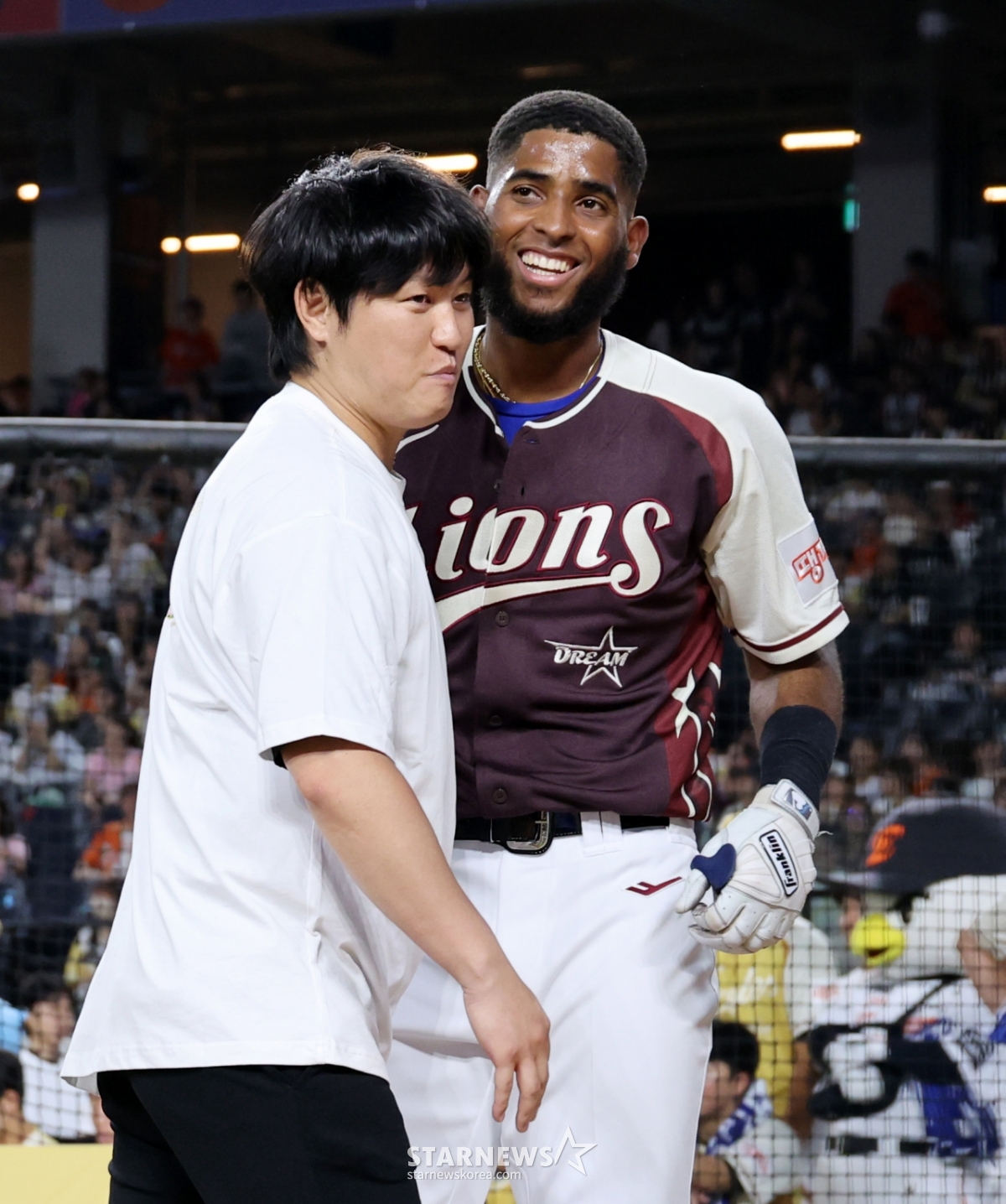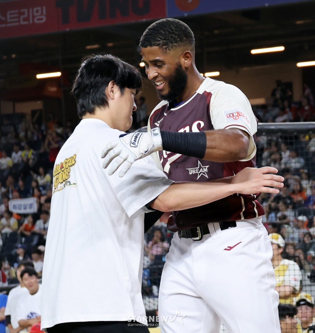 삼성 디아즈가 11일 대전한화생명볼파크에서 열린 2025KBO리그 퓨처스리그 올스타전 남부리그 대 북부리그 경기 종료후 진행된 올스타 홈런레이스에서 박동원을 꺾고 우승한 후 볼을 던져준 이우일 매니저와 포옹하고 있다. 2025.07.11.