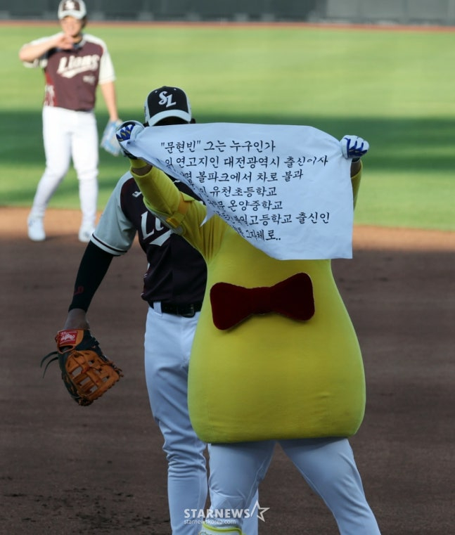 이글스파크에서 10분 거리의 대전 유천초등학교 출신 한린이(한화+어린이 팬)의 대전 자부심은 허언이 아니었다. "내가 대전 출생이다 보니 대전을 대표하는 것으로 퍼포먼스를 준비했다"고 말한 문현빈은 대전을 대표하는 캐릭터 꿈돌이 탈을 쓰고 타석에서 환호를 받았다. 대전관광공사도 적극적으로 협조해 이뤄진 컬래버레이션으로 꿈돌이와 함께 등장한 문현빈은 바로 안타를 뽑아냈다. 그런 뒤 1루에서 한 팬이 자신을 장문의 글로 소개하는 밈을 완벽하게 소화해 팬들의 웃음을 자아냈다.