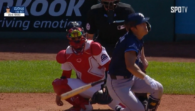 불운은 여기서 끝나지 않았다. 이후 5,6구를 골라낸 뒤 시속 94.4마일(151.9㎞) 7구 싱커가 이번엔 존을 벗어나 더 김하성의 몸쪽으로 깊숙하게 향했다. 김하성의 타구는 또 파울이 됐는데 이번엔 오른쪽 무릎을 직격했다. 통증이 심한 듯 타석에서 벗어나 고개를 떨구고 한숨을 내쉬었다. 9구 승부 끝에 루킹 삼진으로 물러난 김하성은 다리를 절뚝이며 더그아웃으로 물러났다.