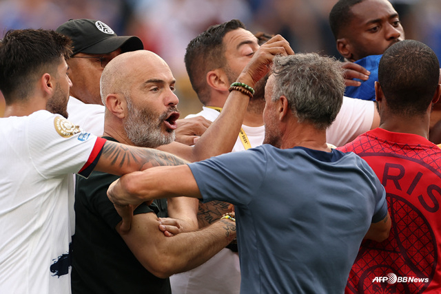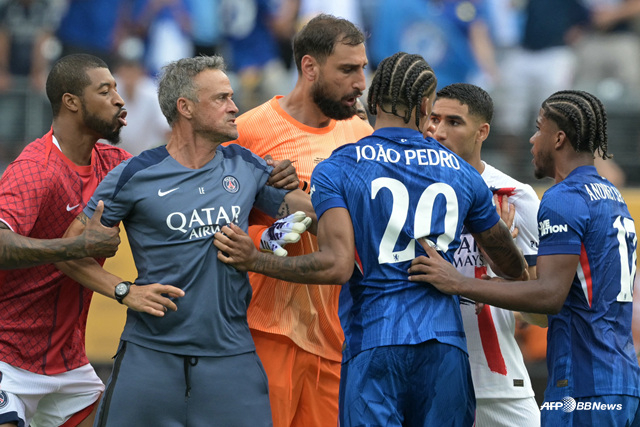 심지어 경기가 끝난 뒤에는 양 팀 선수단이 충돌했다. PSG 골키퍼 잔루이지 돈나룸마, 아치라프 하미키 등 몇몇 선수들이 뒤엉키는 등 흥분을 감추지 못했다. 이 과정에서 엔리케 감독도 폭발했다. 첼시 공격수 주앙 페드루의 뺨을 때렸다. 페드루는 그라운드에 쓰러져 고통을 호소했다.