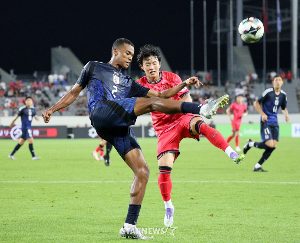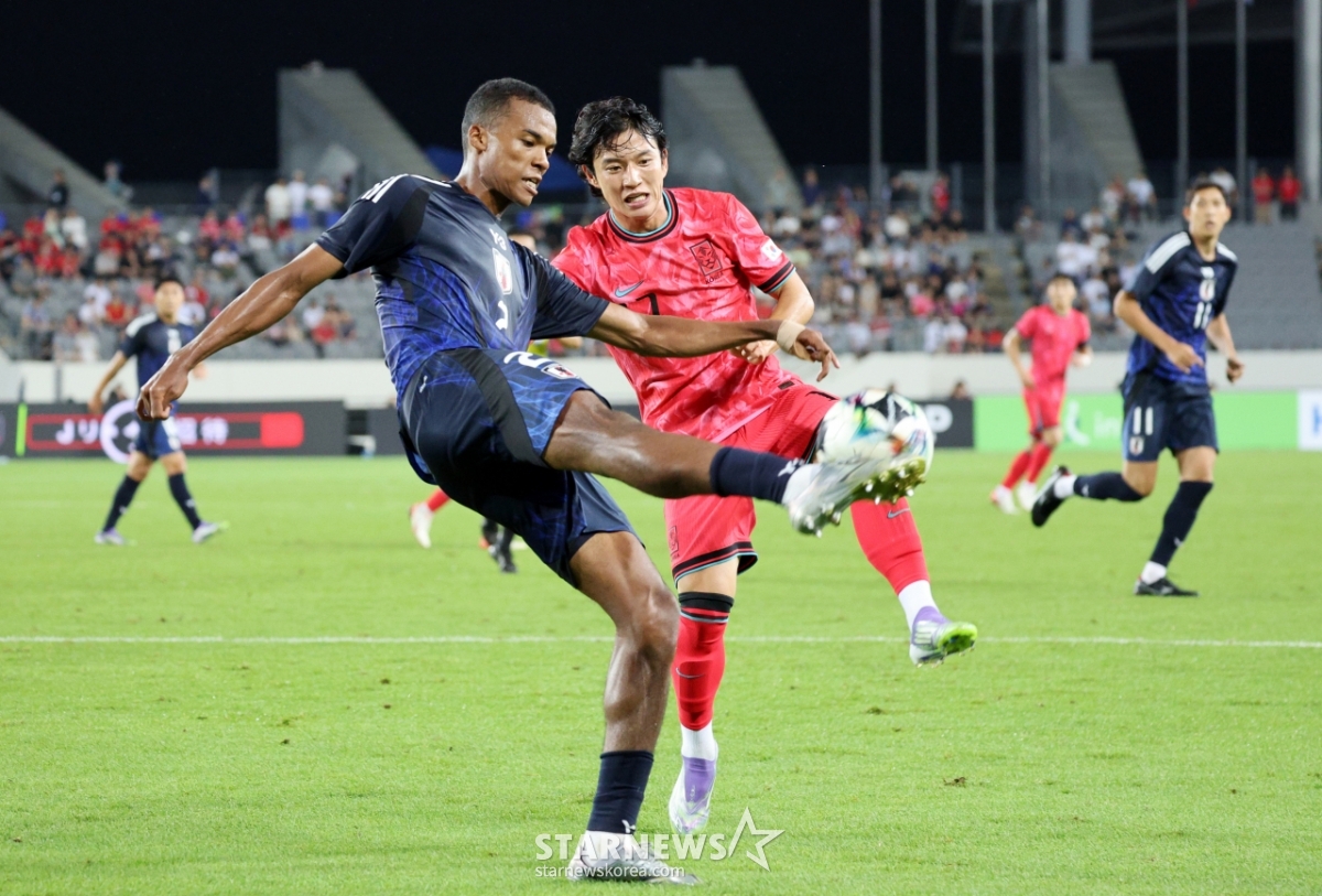 대한민국 축구대표팀 정승원이 15일 용인미르종합운동장에서 열린 2025 동아시아축구연맹(EAFF) E-1 챔피언십(동아시안컵) 일본과의 최종전에서 모치주키와 볼을 다투고 있다. 2025.07.15.