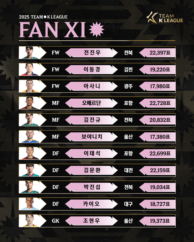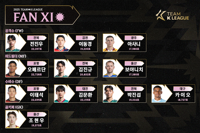 공격수(FW) 부문에서는 K리그1 득점 선두 전진우(전북·2만 2397표)와 이동경(김천·1만 9220표), 아사니(광주·1만 7980표)가 선발됐다.