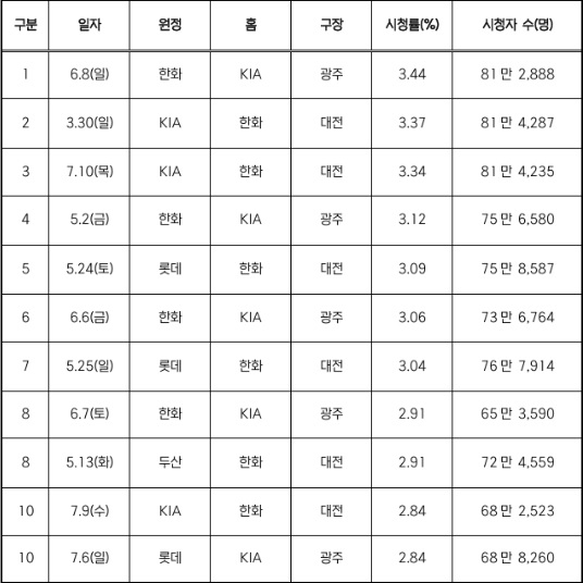 한편, 시청률 3%를 넘긴 경기는 총 7경기로 KIA-한화 간의 경기가 5차례, 롯데-한화 간의 경기가 2차례 있었다. 2024 시즌 전반기에는 시청률 3%를 넘긴 경기가 전무했다. 시청률 2%를 넘긴 경기는 총 47경기로 지난 시즌 전반기의 26경기에 비해 많이 늘어났다. 특히 올 시즌 52승 2무 33패로 33년 만에 전반기 1위를 확정한 한화는 TV 시청률 톱11 중 10경기를 자신들의 경기로 채우며 인기를 입증했다.