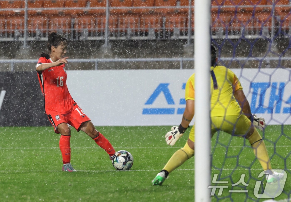 이후 한국은 내려선 대만의 수비벽을 뚫느라 고전했고, 36분 장슬기의 왼발 슈팅은 골키퍼 선방에 막혔다. 전반 중반부터 대만도 라인을 끌어올리며 역습을 노렸으나, 팽팽한 중원 싸움 끝에 전반전은 0-0으로 종료됐다.