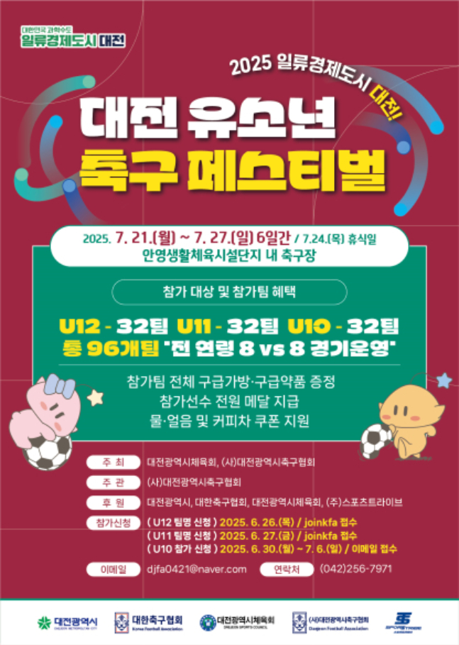 대전시축구협회는 오는 21일부터 27일까지 대전 중구 안영생활체육시설단지 내 축구장에서 '2025 일류 경제도시 대전 유소년 축구 페스티벌이 열린다고 16일 밝혔다.
