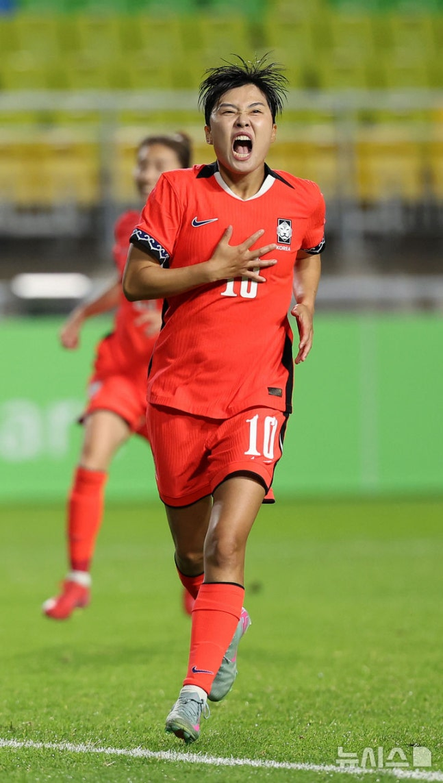후반 13분 강채림(27·수원FC 위민)이 귀중한 페널티킥을 얻어냈다. 상대 수비수가 뒤에서 무리하게 볼을 빼앗으려다 강채림을 가격했다. 페널티킥 키커로는 1991년생 에이스 지소연(34·시애틀 레인)이 나섰다. 넣으면 우승에 한 걸음 다가설 수 있지만, 자칫 실축이라도 한 뒤 우승에 실패라도 하면 거센 후폭풍이 불가피한 상황. 엄청난 중압감에도 지소연은 정확하게 페널티킥을 차내며 균형을 깨트렸다.