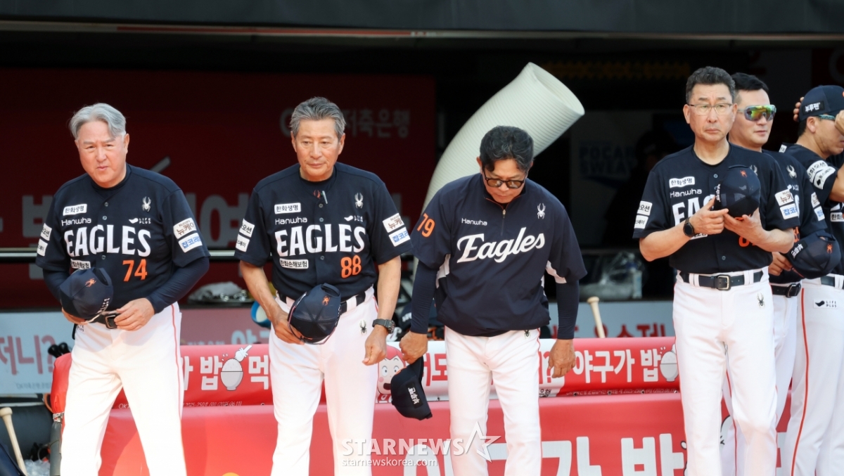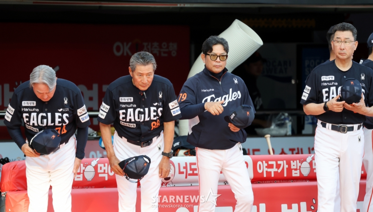 한화 김경문 감독 양승관수석, 양상문 투수코치, 김민호 타격코치가 20일 수원KT위즈파크에서 열리는 2025KBO리그 한화이글스와 KT위즈 경기에서 인사를 하고 있다. 2025.07.20.