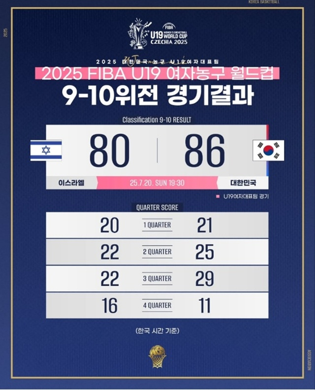 강병수 감독이 이끄는 한국 U-19 대표팀은 20일(한국시간) 체코 브르노에서 열린 2025 국제농구연맹(FIBA) 여자농구 월드컵 9~10위 결정전에서 이스라엘을 86-80으로 꺾었다.