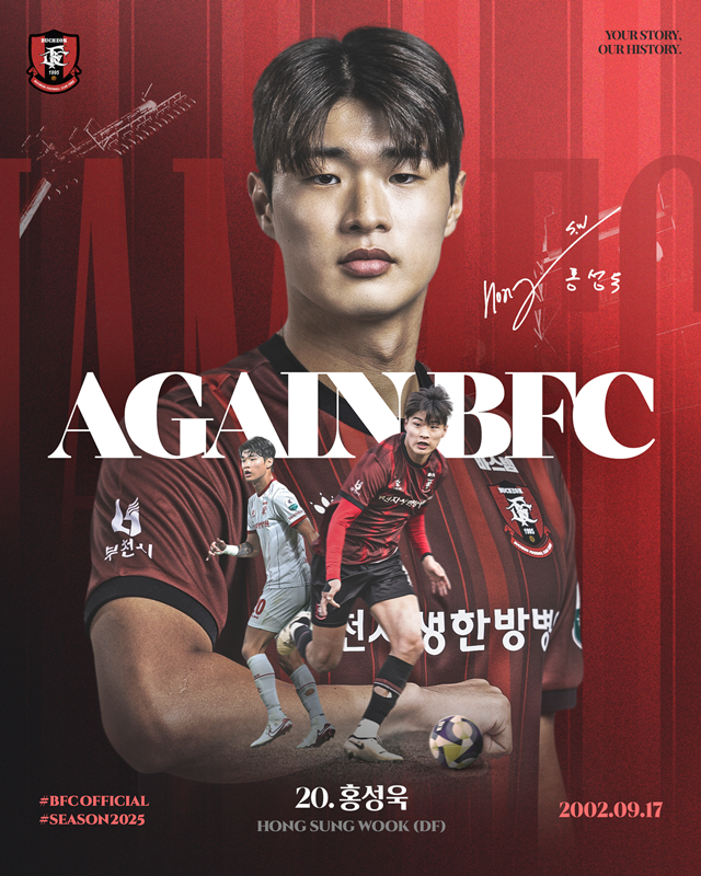 프로축구 K리그2 부천FC1995가 2002년생 수비수 홍성욱(23)과 계약 연장에 합의했다고 21일 밝혔다. 이로써 홍성욱은 2027년까지 부천 유니폼을 입고 함께하게 됐다.