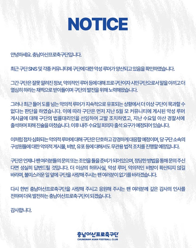 그러나 최근 들어 도를 넘는 악의적 루머가 지속적으로 유포되는 상황에서 더 이상 구단이 묵과할 수 없다는 판단을 하였습니다. 이에 따라 구단은 먼저 지난 5월 모 커뮤니티에 게시된 악성 루머 게시글에 대해 구단의 법률대리인을 선임하여 고발 조치하였고, 지난 수요일 아산 경찰서에 출석하여 피해 진술을 마쳤습니다. 이후 내주 수요일 피의자 출석 요구가 예정되어 있습니다.
