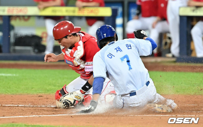 그 사이 3루 주자 이재현도 스타트를 끊었다. 주자를 몰던 유격수 안상현이 다급하게 홈으로 공을 뿌렸으나 송구가 벗어나 주자가 홈을 파고들었다.