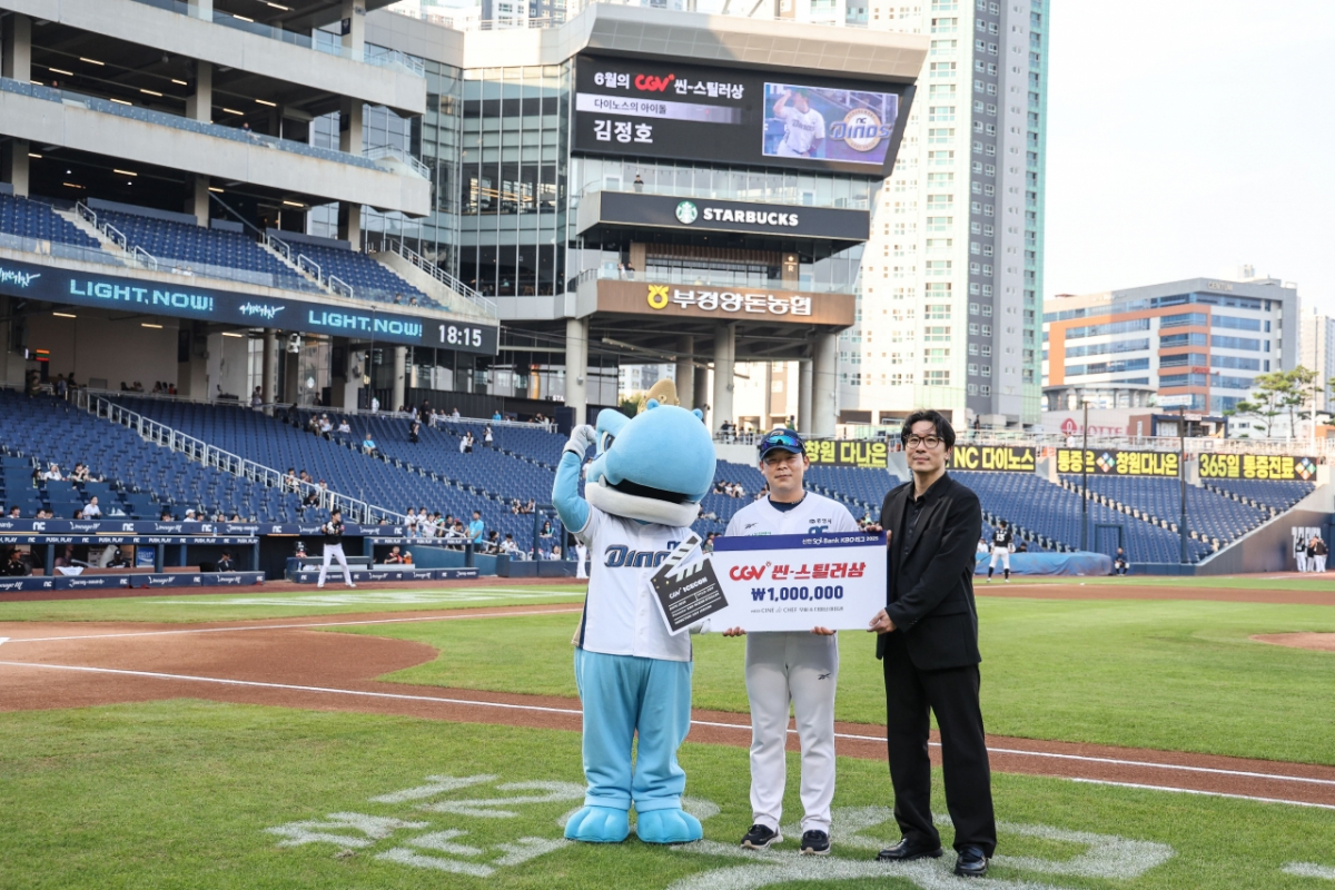 KBO와 CGV는 전날(23일) 창원 NC파크에서 경기 전 시상식을 진행했다. CGV ICECON사업팀 김진호 팀장이 참석, 수상자인 김정호에게 상금 100만원을 비롯해 CGV 씨네드쉐프 무비&다이닝 패키지를 부상으로 수여했다.