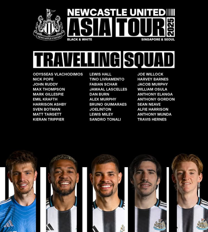 뉴캐슬 구단은 24일(한국시간) 공식 채널을 통해 2025 아시아 투어에 나서는 30명의 선수 명단을 발표했다. 이미 뉴캐슬 선수단은 출국길에 올랐고, 싱가포르에서 아스널과 프리시즌 친선경기를 치른 뒤 한국으로 이동할 예정이다. 한국에선 이달 30일 팀 K리그와 수원월드컵경기장에서, 내달 3일 토트넘과 서울월드컵경기장에서 각각 2025 쿠팡플레이 시리즈를 치른다.
