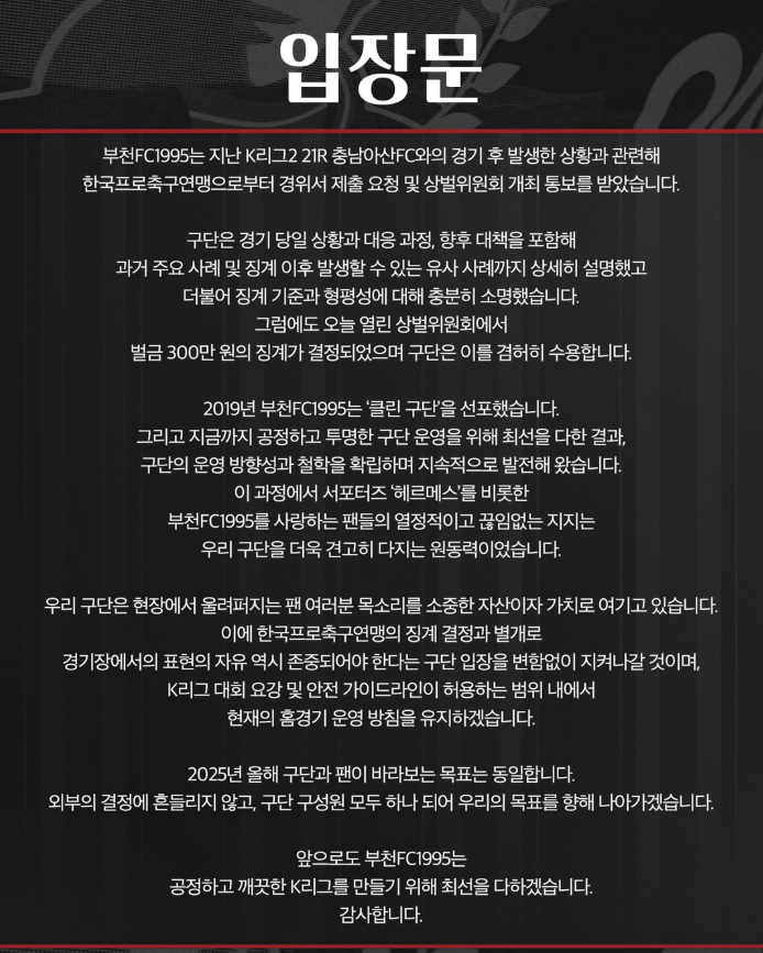 부천FC 구단도 제재금 징계 직후 입장문을 통해 "결정된 징계를 겸허히 수용한다"면서도 "구단은 현장에서 울려 퍼지는 팬 여러분 목소리를 소중한 자산이자 가치로 여기고 있다. 이에 연맹의 징계 결정과 별개로 경기장에서의 표현의 자유 역시 존중되어야 한다는 구단 입장을 변함없이 지켜나갈 것이며, K리그 대회 요강 및 안전 가이드라인이 허용하는 범위 내에서 현재의 홈경기 운영 방침을 유지하겠다"고 밝혀 부천 팬들은 물론 다른 팀 팬들에게도 박수를 받았다.