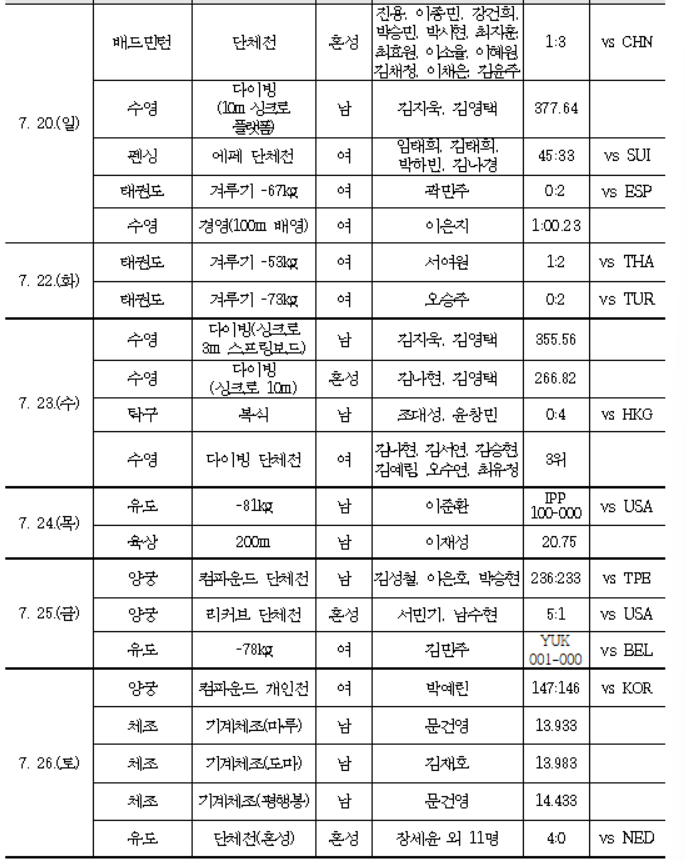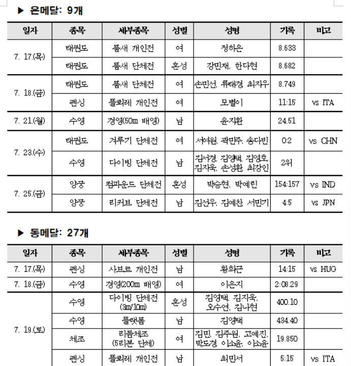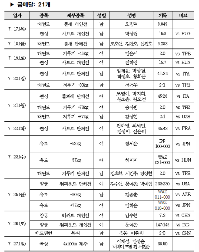 수영에서는 이은지가 여자 배영 200m에서 한국 신기록을 경신하며 동메달을 목에 걸었다. 어깨 수술 후 복귀한 유도의 허미미는 값진 금메달을 획득했고, 육상에서는 남자 4x100m에서 한국 최초로 국제대회 계주 우승이라는 쾌거를 이뤘다.
