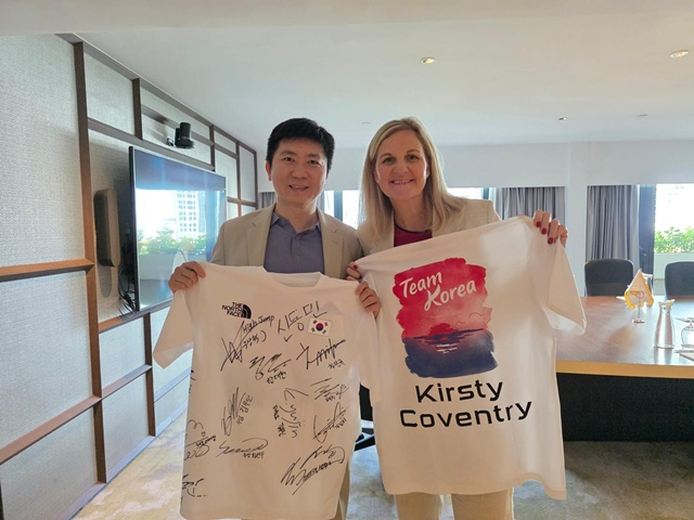 유승민 체육회 회장은 커스티 코번트리 IOC 위원장, 세르미앙 응 IOC 위원, 고든 탕 OCA 부위원장, 후세인 알 무살람 OCA 사무총장 등과의 면담을 통해 다양한 분야에서의 협력 가능성을 논의했다. 특히 코번트리 위원장은 지난 15일 대한체육회 창립 105주년 기념행사에 화상으로 참석해 축하 인사를 전한 데 이어, 이번 대회에서도 양 기관 간 지속적인 우호 협력의 뜻을 함께하며 관계를 더욱 공고히 했다. 이날 유승민 회장은 기념행사 당시 전달하기로 약속했던 대한민국 국가대표 선수단의 사인이 담긴 기념 티셔츠를 직접 전하며 그 의미를 더했다.