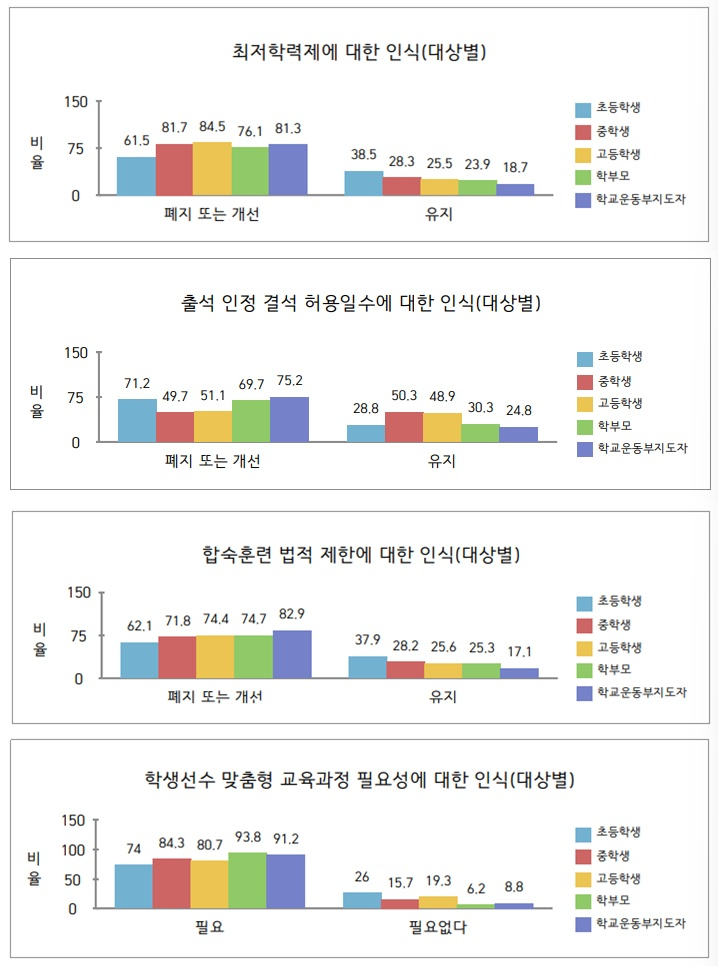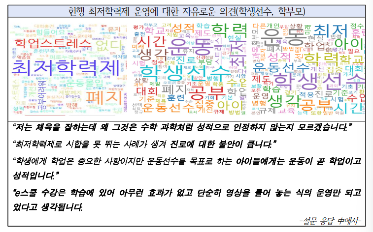설문에 참여한 초·중·고 학생선수와 학부모, 지도자 다수는 최저학력제와 관련해 "폐지 또는 개선이 필요하다"고 응답했다. 초등학생 61.5%, 중학생 81.7%, 고등학생 84.5%가 개선 필요성을 언급했으며, 학부모와 지도자의 경우 각각 76.1%, 81.3%로 나타났다. 일부 응답자는 성적 기준 완화, 교과목 다양화, 학교별 상황을 고려한 평가 방식 등의 개선 방안을 제시했고, 학습 지원을 위한 보충수업, 개별 맞춤형 수업 운영의 필요성도 함께 언급됐다.