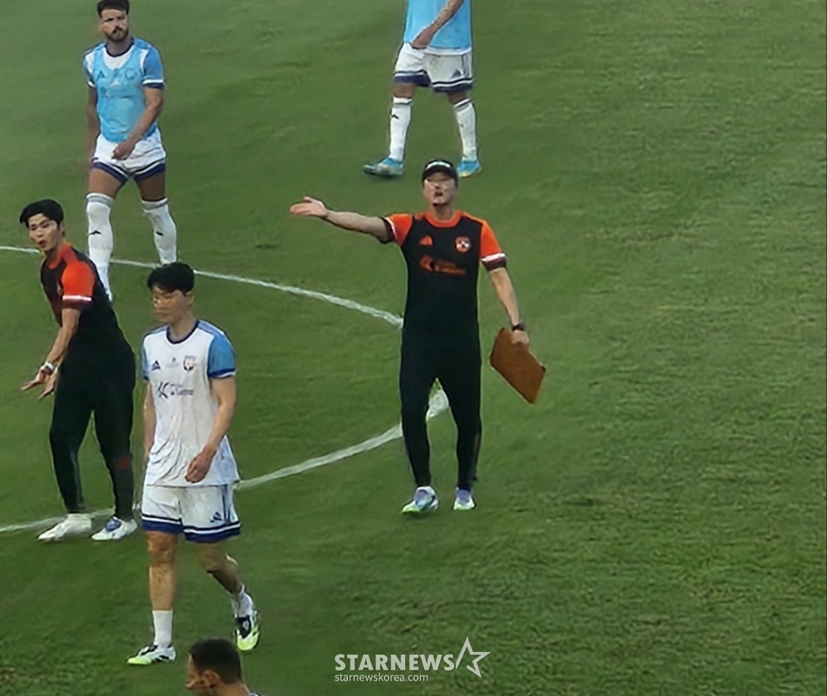 영상 32도를 웃도는 무더위 속에서도 팀K리그 선수들은 화기애애한 분위기에서 훈련에 임했다. 수석코치를 맡은 이정효 감독은 선수들에게 직접 다가가 전술을 지시하며 호흡을 맞췄다. 김판곤 감독은 본격적인 훈련 전 센터서클에 선수단을 불러모아 열정적인 지도를 펼쳤다.