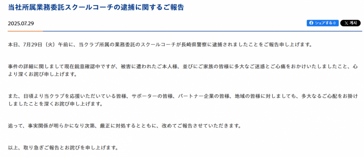 구단은 공식 홈페이지를 통해 "29일 오전에 구단 소속의 학생 코치가 나가사키현 경찰에 체포되었음을 확인했다. 사건에 대한 자세한 조사가 진행 중"이라고 알렸다.