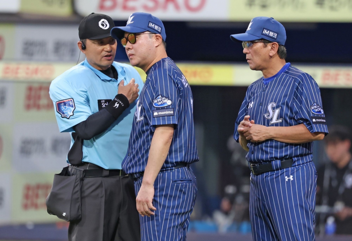 3회말에는 묘한 상황이 연출됐다. 선두타자 김영웅이 7구째 볼에 1루로 출루했다가 다시 타석으로 돌아온 것. 전광판 오류로 2구째 스트라이크가 볼로 잘못 표기됐고, 심판진은 7구째 볼을 4번째 볼로 보고 볼넷으로 판정한 것.
