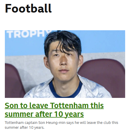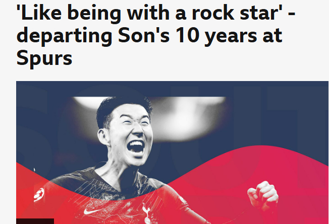 유력지 'BBC'도 손흥민에 헌사를 남겼다. "마치 록스타와 함께 있는 것 같다"며 "454경기에 출전해 173골을 기록한 손흥민은 토트넘에 온 지 10년 만에 새로운 무대로 나아간다"고 알렸다.