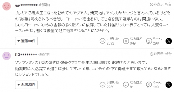 심지어 중국과 일본에서도 손흥민의 이적에 아쉬움과 응원의 메시지를 쏟아내고 있다. '시나스포츠'에 따르면 중국 축구팬들은 "손흥민이 어느 구단에 가도 계속 응원할 것"이라는 댓글이 쏟아졌다. '야후 재팬'에도 "손흥민이 아시아 역대 최고의 선수다. EPL에서 아시아인으로서 엄청난 업적을 남겼다"고 찬사를 보냈다.