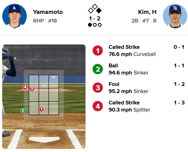 김하성의 안타는 세 번째 타석에서 터졌다. 탬파베이가 0-1로 뒤지고 있는 6회말 2사 주자 없는 상황. 상대 투수는 여전히 야마모토. 바깥쪽 볼 2개를 잘 골라낸 김하성이었다. 유리한 2-0의 볼카운트. 이어 3구째 한가운데 91.8마일(147.7km) 커터를 힘있게 받아쳐 총알 같은 좌전 안타로 연결했다. 메이저리그 공식 홈페이지 MLB.com 게임데이 중계에 따르면 타구 속도는 97.4마일(156.8km)이었다. 야마모토의 투구 수는 88개. 여기서 데이브 로버츠 다저스 감독이 직접 마운드에 올랐다. 다저스는 야마모토를 내리고 알렉스 베시아를 마운드에 올렸다. 탬파베이는 페두시아가 3루수 파울 팝플라이 아웃에 그치며 김하성은 잔루 처리됐다.