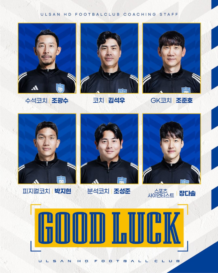 울산 구단은 5일 조광수 수석코치와 김석우 코치, 조준호 골키퍼 코치, 박지현 피지컬 코치, 조성준 분석 코치, 장다솔 스포츠 사이언티스트와 동행을 마무리했다고 밝혔다.